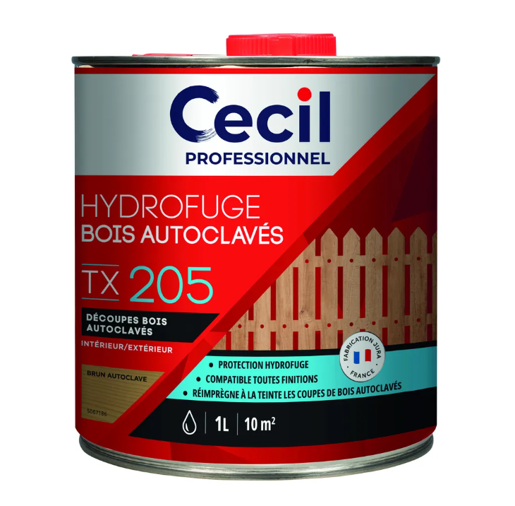 Hydrofuge brun pour bois extérieurs autoclavés, conditionné en flacon de 1 litre, idéal pour protéger et embellir vos surfaces en bois tout en assurant une longue durabilité. Facile à appliquer, il préserve l'aspect naturel du bois.